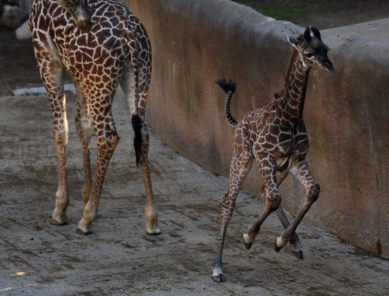 当地时间2016年11月22日,美国洛杉矶,洛杉矶动物园里新添一名小成员,两周前诞生一只雌性长颈鹿。小长颈鹿尚未命名,正和父亲Phillip玩耍嬉戏。