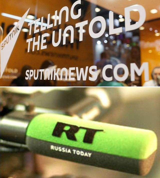 接片:俄“卫星”通讯社(Sputnik,上)和今日俄罗斯电视台。(图片来源:互联网)