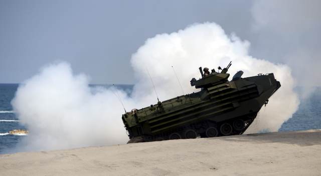 2015年4月21日,美军士兵乘水路两栖突击车在菲律宾三描礼士省附近海域参加菲美2015联合军演。(新华社/路透)