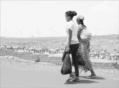 近年来,越来越多的非洲国家把开发可再生能源提上日程,以弥补自身的能源缺口。图为在埃塞俄比亚中部城市阿达玛,两名妇女从一座风电场旁经过。
