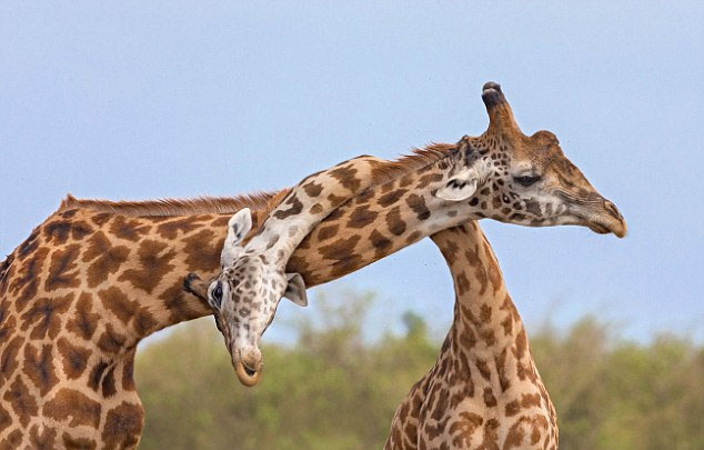 此组照片是一位德国摄影师参观保护区时拍到的,他的照片体现了长颈鹿激烈而有趣的争斗画面:一只长颈鹿试图埋头攻击对手却被后者巧妙躲开,还有一只长颈鹿在对手采取锁头功时猛地把头绕过去。此外,另一幅图还显示一只长颈鹿准备给对手猛地一击时,竟径直盯着摄影师的照相机。