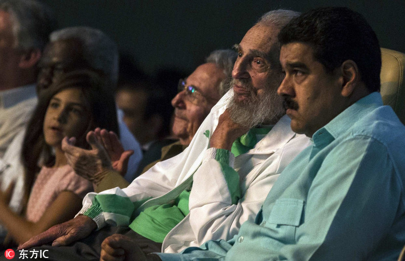 当地时间2016年8月13日,古巴哈瓦那,古巴革命领导人菲德尔-卡斯特罗迎来90岁生日,在古巴现任领导人劳尔卡斯特罗与委内瑞拉总统马杜罗的陪同下,前往“卡尔-马克思”剧院观看演出。