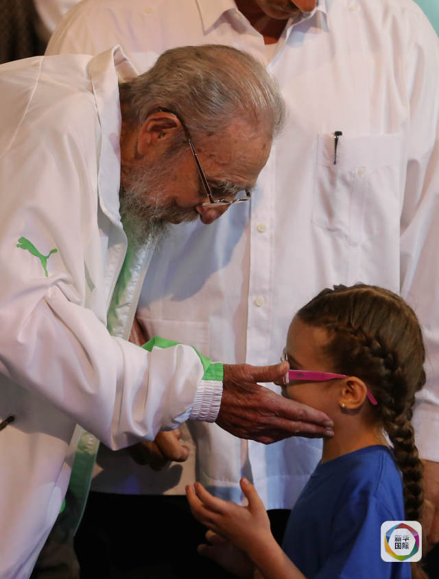 图为8月13日,在古巴首都哈瓦那,菲德尔·卡斯特罗在自己90岁生日庆祝活动中与一名女孩交流。新华社/路透