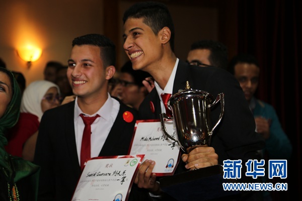 11月26日,埃及开罗,大学生诗词朗诵大赛的获奖选手露出自豪笑容。新华网发