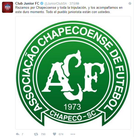 【环球网报道 记者 查希】英国《卫报》11月29日报道,哥伦比亚球队巴兰基利亚青年队(Barranquilla’s Junior)在推特上发文称,“为沙佩科恩斯队和机组人员祈祷,在这个艰难时刻,我们与你们同在,我们的球迷也与你们同在。”