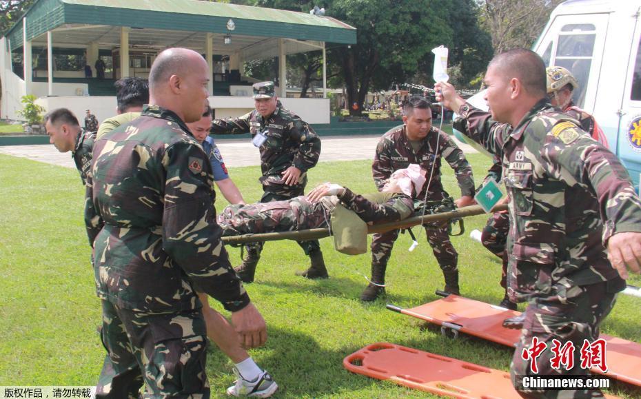 载有总统府卫队成员的车队29日上午途经马拉维(Marawi)一条小路时,路旁突然发生爆炸,导致9人受伤。杜特尔特预定于当地时间30日到马拉维市视察,总统府卫队先行抵达安排安保事宜。菲律宾军方公共关系处处长阿雷巴洛(Edgard Arevalo)说,当时车队准备前往市区的陆军军营,结果带头的军车被爆炸碎片击中,7名保镖和2名士兵受伤。图为一名受伤的总统保安队成员被空运到一处军营治疗。该士兵遭遇路边炸弹袭击。