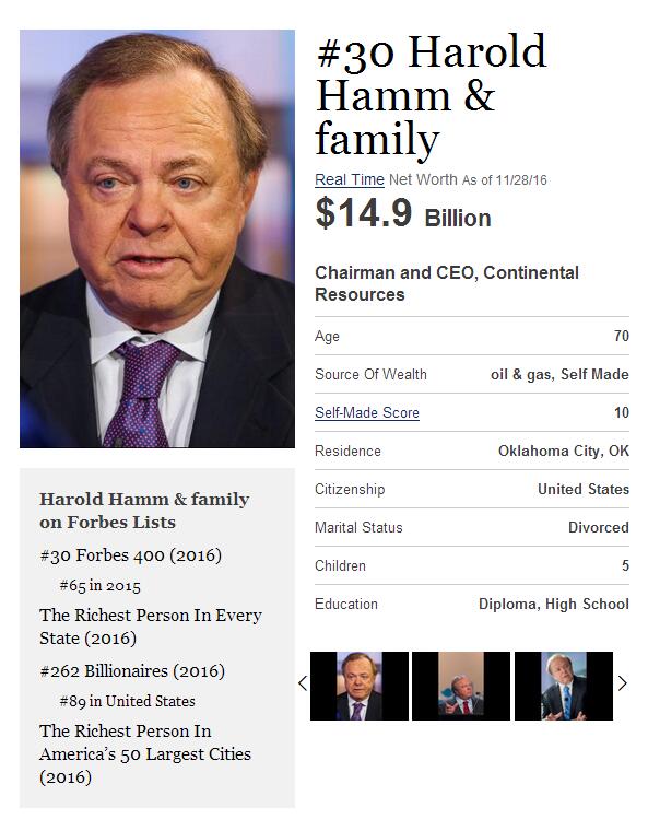 在这群超级富豪中,排名第一的是提名能源部长的哈罗德·哈姆,身价150亿美元,福布斯排行榜第30位。