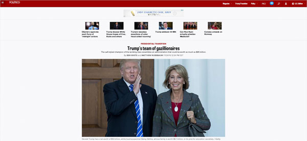 对于阵容如此豪华的内阁成员提名,Politico引用批评人士尼拉·坦顿(Neera Tanden)的话说,“这些选择是他对工人阶级选民的背叛。特朗普声称他会打击全球精英亿万富翁阶层; 相反,他把钥匙交给了他们。”