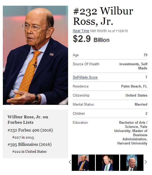 提名商务部长的威尔伯·罗斯有“破产之王”的绰号,其多次收购不同行业的破产企业,令其起死回生,从中获利。在2011年的欧债危机中,罗斯抄底爱尔兰银行,使其摆脱被政府接管的命运,2014年则在银行股价回归之际抛售该行股票,不到三年大赚近三倍。