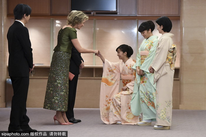 当地时间2016年10月13日,日本东京,比利时国王费利佩和王后玛蒂尔德到访日本第四日,与德仁皇太子、真子与佳子公主等王室成员会面。