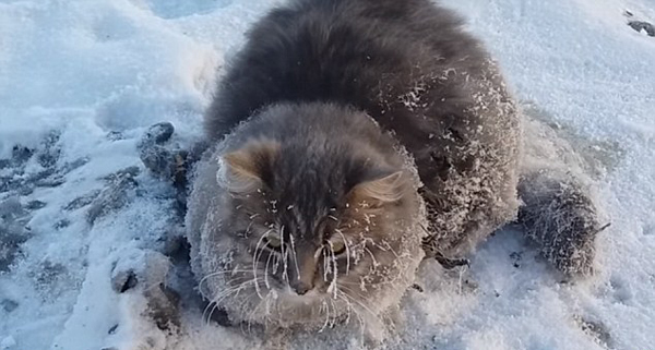 这段拍摄于11月28日的视频显示,这只猫坐在地上,被冻住的爪子夹在它的身体下面,冷得直颤抖。所幸的是,一对俄罗斯夫妇发现了它,立即用热水使冰融化,帮助它逃离冰坑。