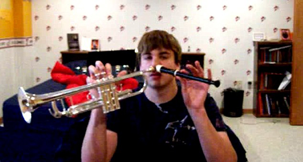 世界上时常有人上演一些奇葩的才艺秀,这名来自美国爱荷华州的天才音乐家上传的一段视频就让网友惊呆了。视频中,该男子坐在卧室,左手拿直笛,右手拿小号,插到鼻孔中,一边一个,然后就开始他画风清奇的音乐才艺秀:同时用两个乐器演奏美国著名的福音歌《圣者的行进》(When The Saints Go Marching In)。