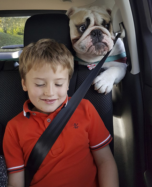 据悉,通常在车里,弗雷迪都会乖乖坐着,或是像其它狗狗一样安静的睡觉,但是阿曼达36岁的男友马特·怀亚特(Matt Wyatt)开车的那天情况就大不相同了。斗牛犬弗雷迪面露惊恐,头扭向车窗,紧抓车后座,靠近7岁的哈里森(Harrison)以寻求安全感,逗得哈里森在车后座咯咯笑。