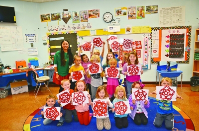 图为曾畅畅老师与韦斯特赛德小学一年级学生在完成剪纸后合影。 王传军摄/光明图片