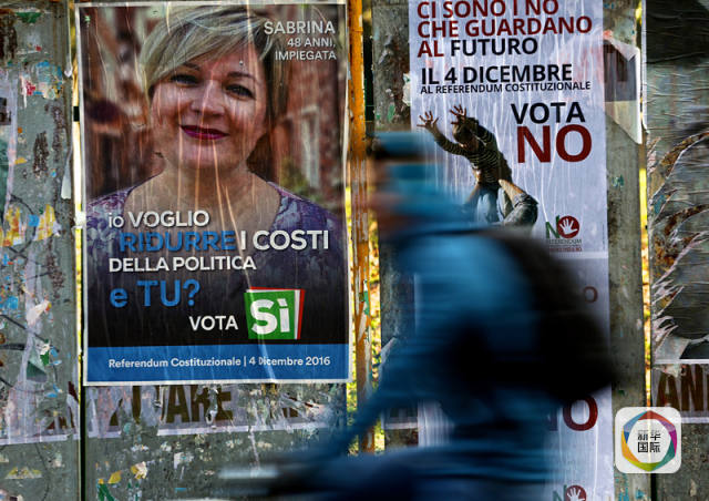12月1日,在罗马,一名男子骑车从支持和反对修宪的海报前经过。新华社记者金宇摄