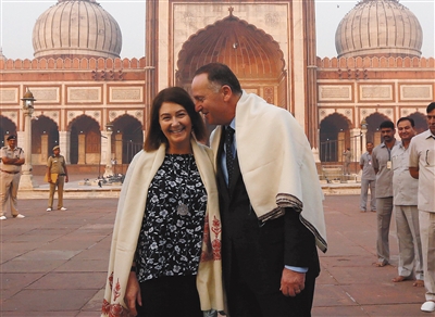当地时间10月27日,印度新德里,新西兰总理约翰·基偕妻子布罗娜访问印度,参观印度最大清真寺贾玛寺。 图/视觉中国