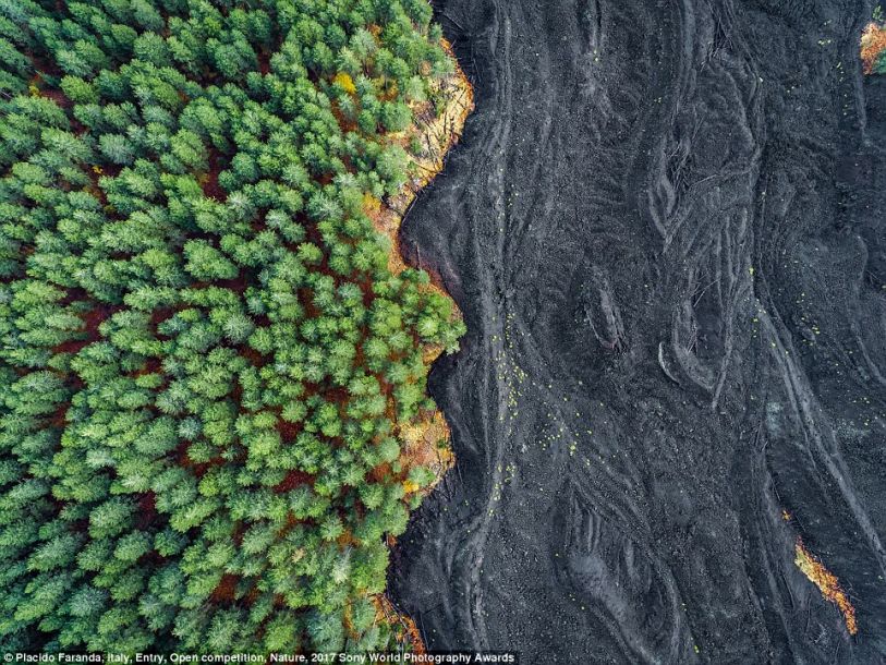 Placido Faranda的无人机航拍作品,凝固的熔岩和附近的森林形成鲜明对比。