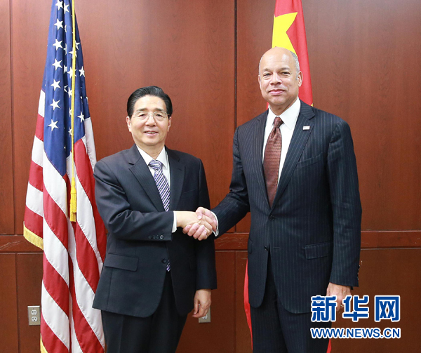 12月7日,在美国华盛顿,中国国务委员、公安部部长郭声琨(左)和美国国土安全部部长约翰逊握手。当日下午,中国国务委员、公安部部长郭声琨和美国国土安全部部长约翰逊在华盛顿共同主持两部第三次部级会晤。 新华社发