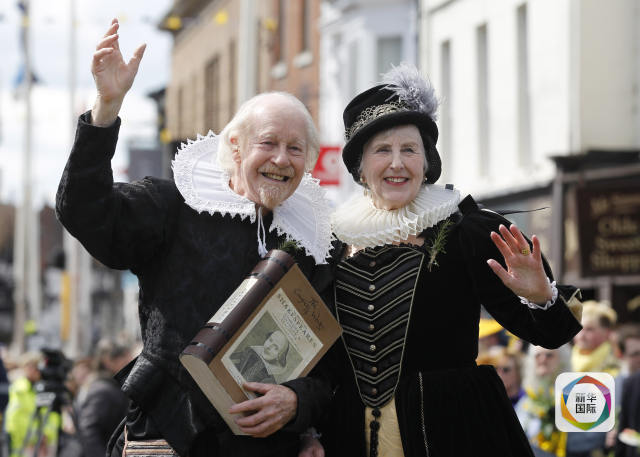 2016年4月23日,在英国埃文河畔斯特拉特福,一位扮成莎士比亚的男演员与扮成莎士比亚妻子的女演员参加庆祝活动。(新华社记者韩岩摄)