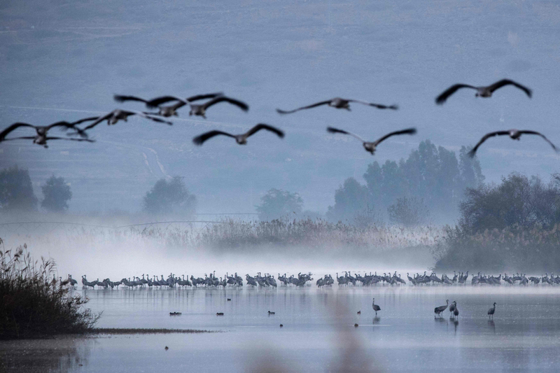 当地时间2016年12月7日,以色列胡拉谷地,大量鹤群迁移,飞过天际,场景壮观。