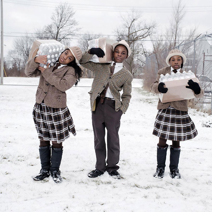 美国密歇根州弗林特(Flint),三兄妹正从3号消防站领取特殊津贴——瓶装水。