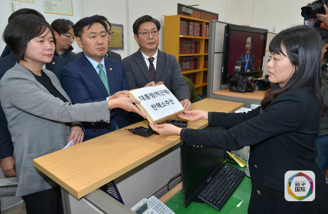 12月3日,在韩国首尔,韩国在野党及无党派议员(左)向国会提交写有“总统(朴槿惠)弹劾案”字样的文件。新华社/纽西斯通讯社