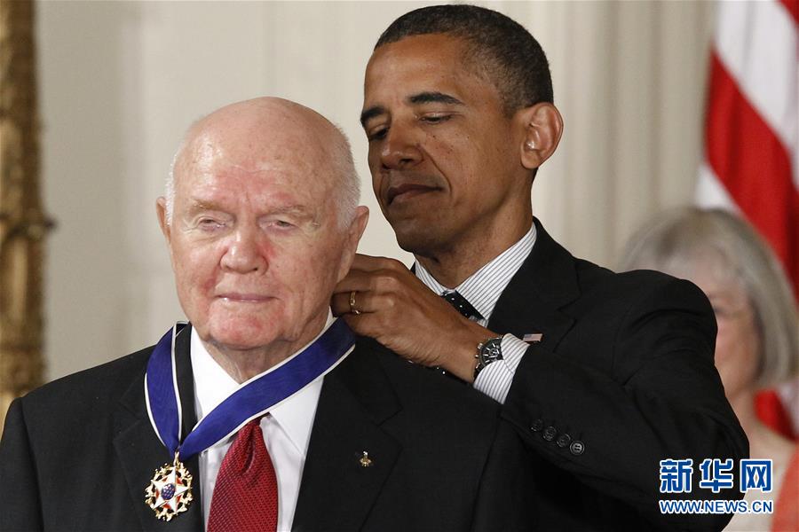 12月8日,美国首位绕地球飞行的宇航员约翰·格伦辞世,享年95岁。1962年,格伦乘坐“友谊7号”飞船进入地球轨道,成为绕地球飞行的第一名美国人。这是2012年5月29日,美国总统奥巴马在华盛顿白宫授予宇航员约翰·格伦自由勋章的资料照片。新华社/美联
