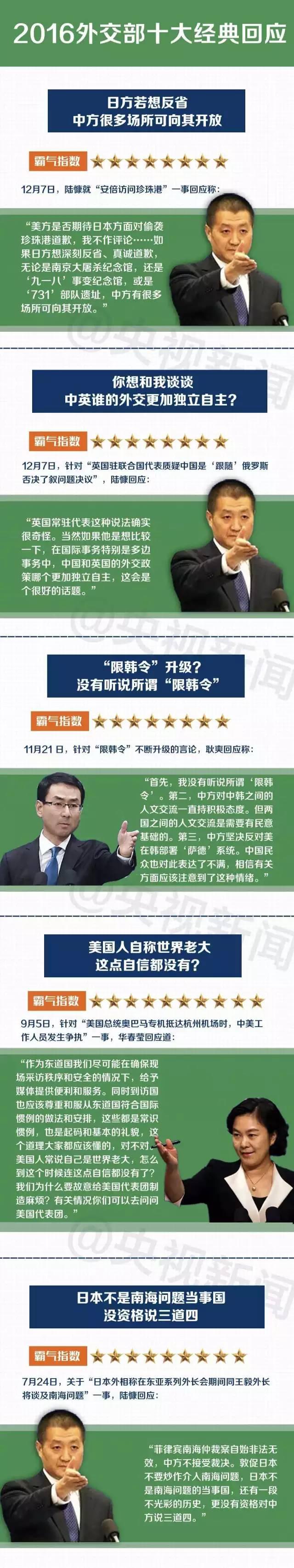 下面是2016年外交部十大精彩回应,每一条都相当帅气,有理有据,有力有节。