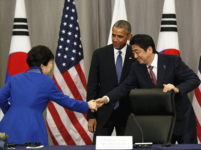 资料图:3月31日,华盛顿,三边会谈后,美国总统奥巴马(中)、日本首相安倍晋三(右)、韩国总统朴槿惠出席联合新闻会。(新华/美联)