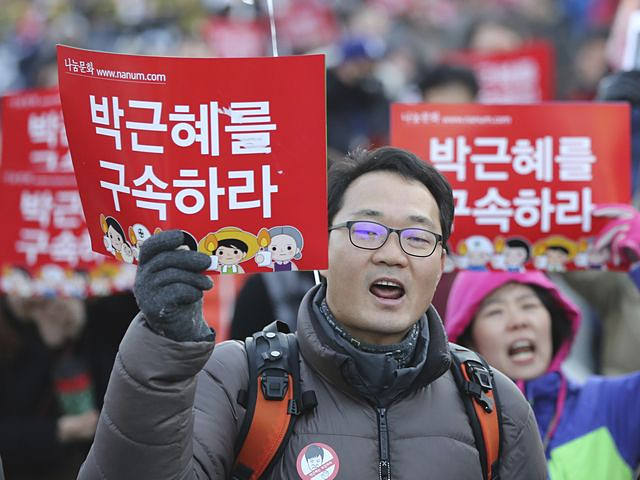 12月10日,抗议者举着要求逮捕朴槿惠的标语牌,向首尔市中心青瓦台总统府方向走去。(新华/美联)
