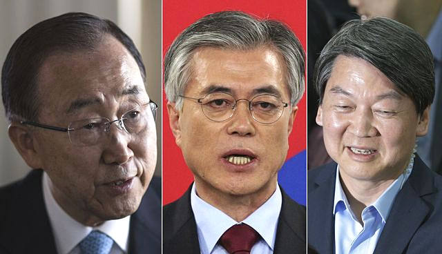 从左往右:潘基文、文在寅、安哲秀。(新华/美联)