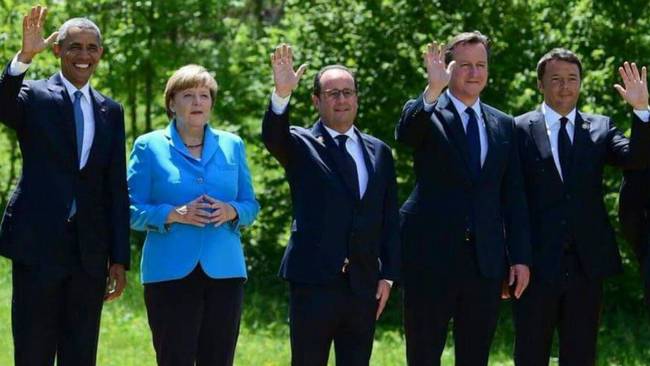照片上从左到右依次是:美国总统奥巴马、德国总理默克尔、法国总统奥朗德、时任英国首相卡梅伦和意大利总理伦齐。