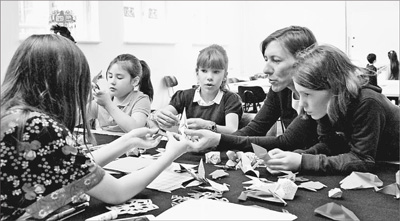 在柏林自由大学孔子学院的开放日活动上,几名德国孩子正在学习折纸。本报记者 管克江摄