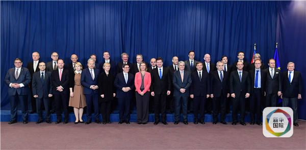 12月12日,在比利时首都布鲁塞尔,古巴外长罗德里格斯(前排左七)、欧盟外交和安全政策高级代表莫盖里尼(前排左八)以及欧盟28个成员国代表合影。(新华社/法新)