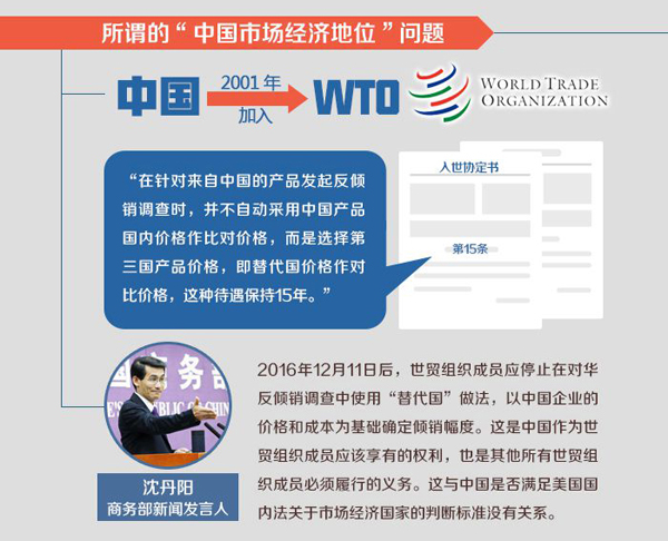 根据中国加入世贸组织议定书第15条规定,世贸组织成员对华反倾销“替代国”做法于12月11日终止。但现在有人反悔了,不认账了。国际协定中,有一个亘古不变的规矩,就是言必信、行必果。这是当时大家的约定,现在该兑现了。