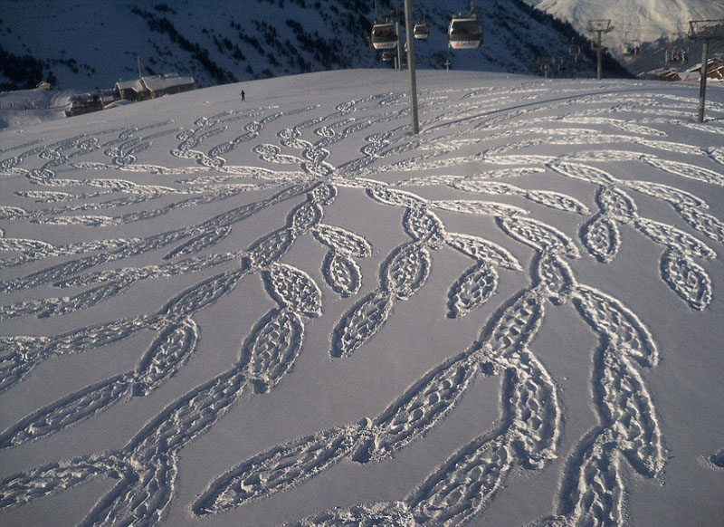 来自英国布拉克内尔的艺术家西蒙 贝克仅靠指南针,在法国阿尔卑斯山上用双脚在积雪上踩出繁复巨大的图案,并用相机记录下这些图案,发到网上后引发网友赞叹。