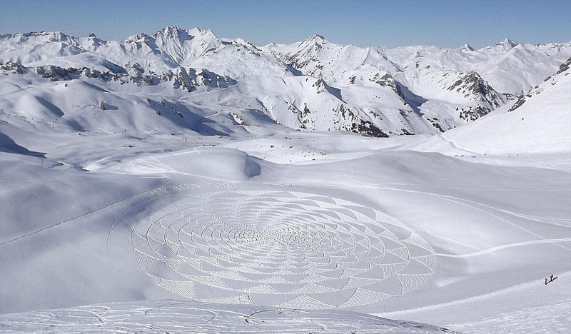 来自英国布拉克内尔的艺术家西蒙 贝克仅靠指南针,在法国阿尔卑斯山上用双脚在积雪上踩出繁复巨大的图案,并用相机记录下这些图案,发到网上后引发网友赞叹。