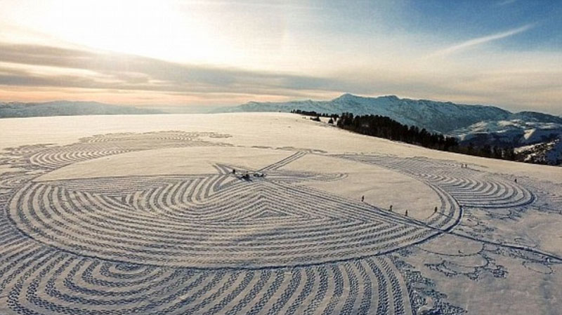 这位定向地图设计师在积雪覆盖的大片空地上进行创作。他先在图纸上画出图案,然后勘察现场,标出重要的地点,并使用步伐计数或卷尺来计算其他位置到该点的距离,以确定数值。每个图案都包括线条、几何图形、曲线和弧线等元素。他平均要花10个小时才能完成一件作品,估计每个作品要走超过25英里(约40千米)的路。