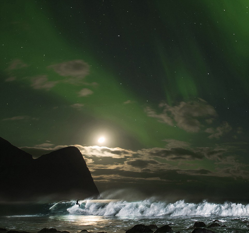 近日,澳大利亚35岁的男子米克 范宁(Mick Fanning)在挪威北极光的照耀下挑战极限冲浪,欣赏不一样的自然风光。