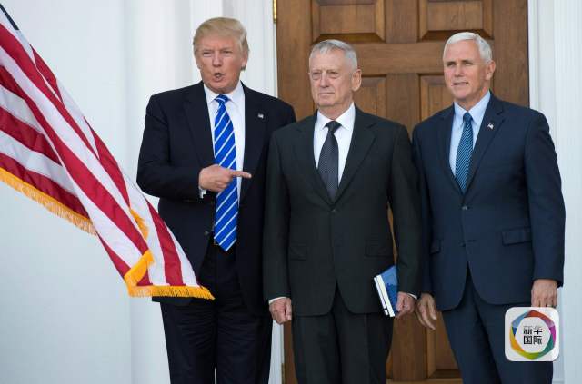 2016年11月19日,美国候任总统特朗普(左)同退役美军上将詹姆斯·马蒂斯(中)和当选副总统迈克·彭斯站在一起。新华社/法新