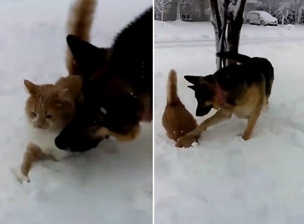 这只淘气的德国牧羊犬名叫凯妮丝(Katniss),而姜黄色的小猫名叫奇威(Kiwi)。视频中,奇威正小心地走在雪地上,看起来对皑皑白雪很困惑的样子,突然,大狗凯妮丝跳到它身边要和它一起玩,但是奇威不想玩。凯妮丝趁奇威不注意,用自己的背把奇威的脸猛推进了雪堆里,然后自己兴奋地“肇事逃逸”了。