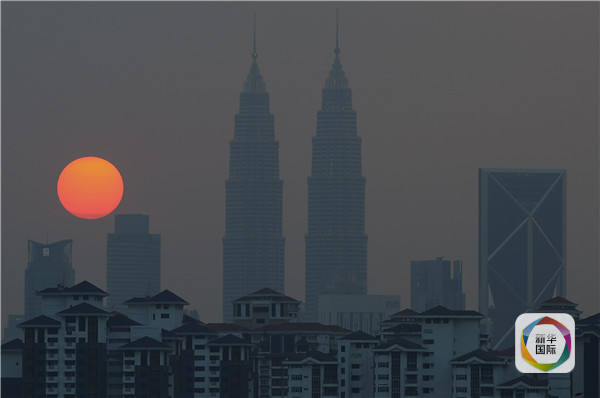 2016年1月30日,透过雾霾看日落时分的马来西亚吉隆坡国营石油公司双子楼。(新华社/法新)