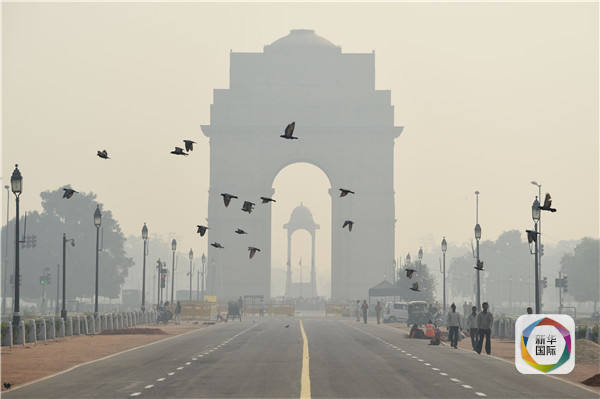 2016年10月28日,严重的雾霾污染中,印度新德里市民走在标志性建筑印度门附近的道路上。据世界卫生组织2014年发布的一份报告,全球污染最严重的20个城市有13个位于印度,其中新德里的污染程度最高(新华社/法新)