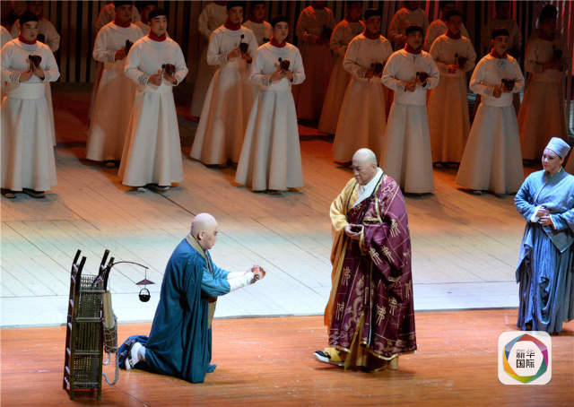 12月20日,在日本东京,演员们表演歌剧《鉴真东渡》中日本遣唐僧(左一)请求鉴真和尚东渡普及佛法一幕。新华社记者马平摄
