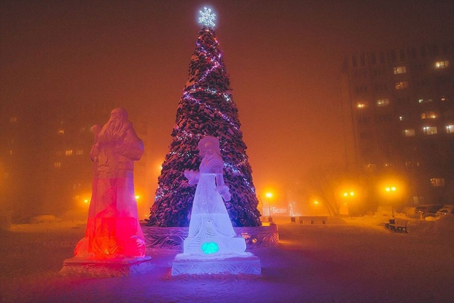 在西伯利亚小镇上的一颗圣诞树,因为冰霜看上去更加有了圣诞的意境。