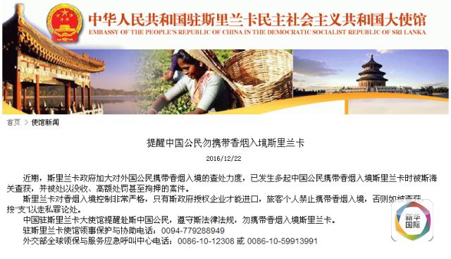 因此,中国驻斯里兰卡大使馆提醒赴斯中国公民,遵守斯法律法规,勿携带香烟入境斯里兰卡。(记者杨梅菊,新华国际客户端报道)