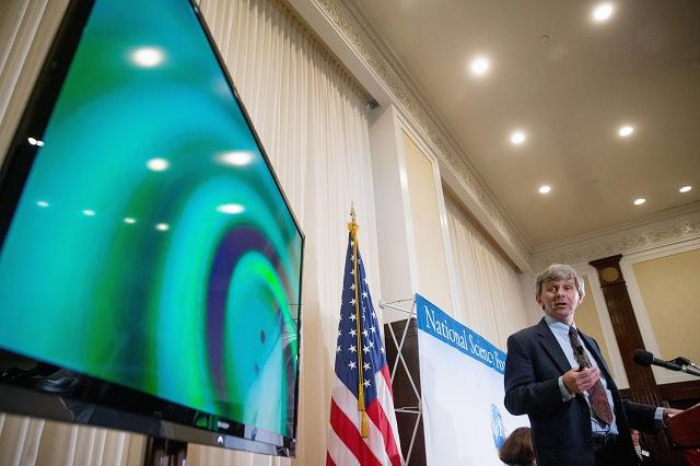 2016年2月11日,在美国首都华盛顿举行的新闻发布会上,美国“激光干涉引力波天文台”(LIGO)执行主任戴维·赖茨向媒体展示两个黑洞合并产生的引力波信号图像。 美国加州理工学院、麻省理工学院以及LIGO的研究人员当天在华盛顿举行记者会,宣布他们利用LIGO探测器于2015年9月14日探测到来自于两个黑洞合并的引力波信号。引力波是爱因斯坦广义相对论实验验证中最后一块缺失的“拼图”,它的发现是物理学界里程碑式的重大成果。(新华社/美联)