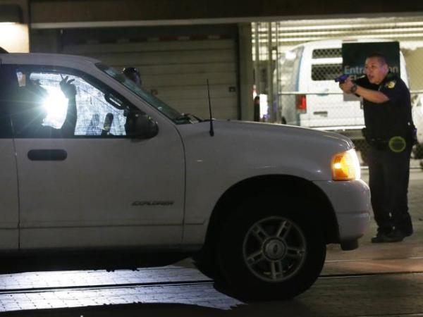 2016年7月7日,美国得克萨斯州达拉斯,一名警察用枪指着一名司机。(新华/美联)