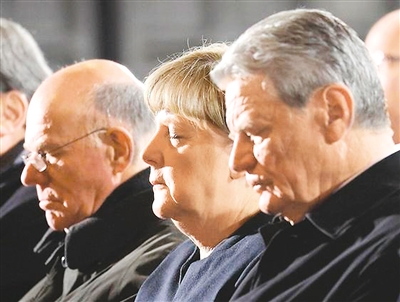 图为12月20日下午,德国总理安格拉·默克尔(中)在威廉皇帝纪念教堂参加悼念活动。