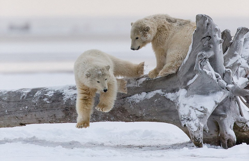 42岁的自然摄影师克里斯托弗 瓦瑟兰(Christophe Vasselin)在美国阿拉斯加州拍摄了一组北极熊搏斗的照片。小家伙们在倒下的树干周围跌倒,一只小熊爬到了树干上方,然后开始打架。过了一会,一只小熊把另一只推到地上后获得了胜利。